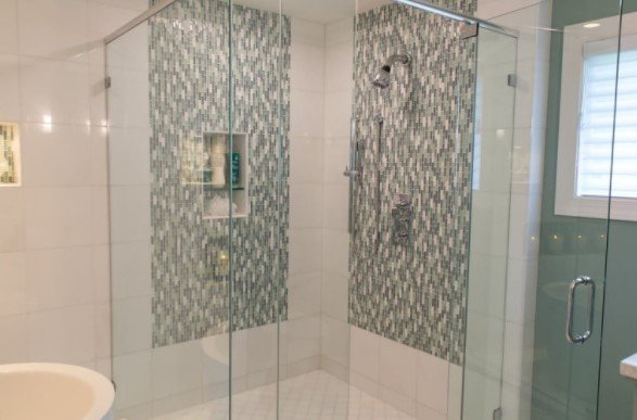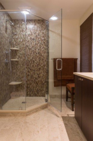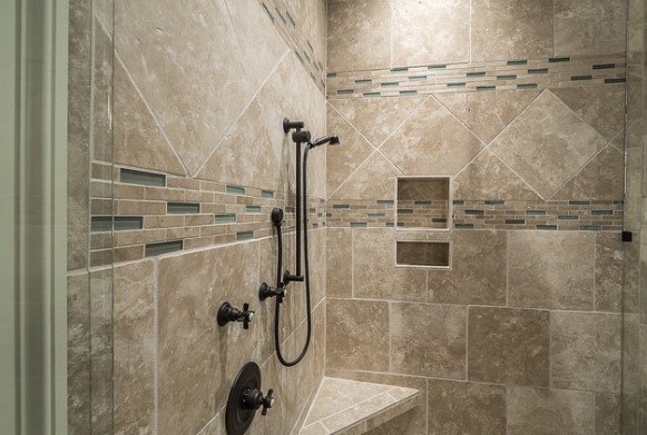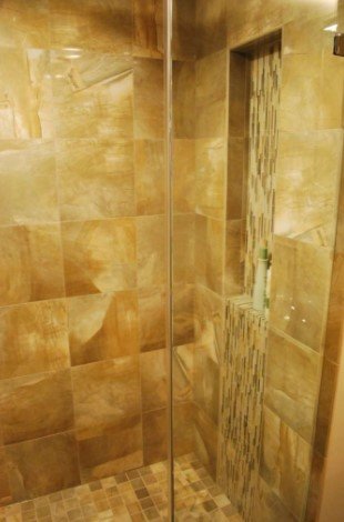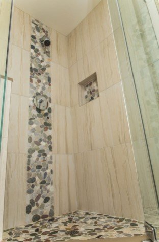 In contrast a waterfall tile design typically refers to a vertical tile accent in direct relationship to the main plumbing feature. This supports the idea of “falling water” even when the shower is not on. Clients are attracted to this type of bathroom tile installation when they are trying for a spa atmosphere, or they are of a Feng Shui sensibility.