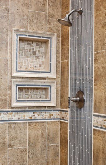 The shower niche, or niches could have been designed to also be vertical. It was also a good choice to not put a mosaic on the back walls of the niche in this case.